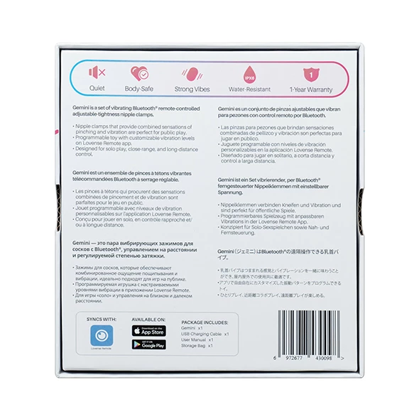 Meet Gemini β the worldβs first app-controlled adjustable vibrating nipple clamps. Wear Gemini however you want. Carry them discreetly and go out for new adventures. From foreplay, roleplay, to light BDSM, you can incorporate our nipple clamps into your routine with Lovense Remote app! Enjoy the perfect combination of clamps and vibrations.